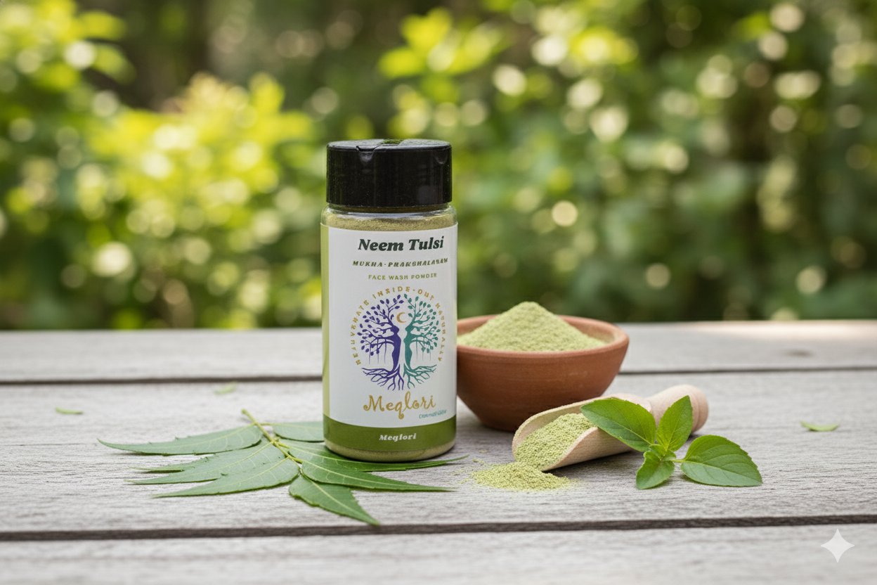 Unlock the ancient secret (Charaka & Sushrutha) to acne-free skin! Meqlori Neem Tulsi powder turns your wash into a purifying ritual.